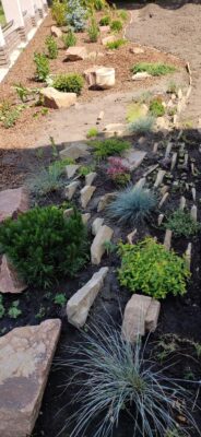 Од капије, стаза води до централног травњака, пролазећи преко два камена степеништа. На благој падини десно налази се каменити врт са биљкама отпорним на сушу, посађеним између камења. Овде се налазе Phlox Cushion, Saxifraga arensii, различите врсте Sedum-а, Thymus “Creeping Red” и други нискорастући вишегодишњи цветови. Међу грмовима су Juniperus squamata “Carpet Blue”, Spiraea japonica, Berberis thunbergii “Atropurpurea”, Pinus mugo “Pumilio” и Ribes alpinum “Schmidt”. Како се падина спушта, карактер засада се постепено мења према шумовитијем изгледу. Глаука плава јела окружена је овде упечатљивим контрастом јесењег лишћа Euonymus alatus-а и Physocarpus opulifolius-а амбер боје.