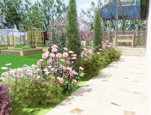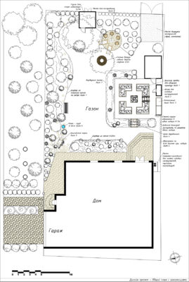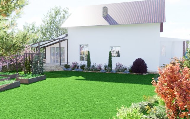 Врт се ствара за велику породицу, како би деца могла да се играју на травњаку, како би се уживало у лепим доручцима на веранди, како би се проводиле топле вечери са пријатељима поред камина, како би се гајило воће и поврће, и како би се дивили лепоти цветова у врту. У складу са потребама породице, парцела је подељена на неколико функционалних зона које се хармонично стапају једна у другу.